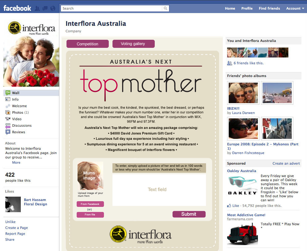 The ‘Australia’s Next Top Mother’ Facebook App was developed with the objective of growing “likes” for the brand and keeping it “top of mind” during the key seasonal Mother’s Day period. Run in conjunction with a major radio network, people were encouraged to nominate their mother by uploading a picture and writing a short paragraph about her. They were then encouraged to spread the word to get the most votes for their “tribute” and so be awarded the major prize.